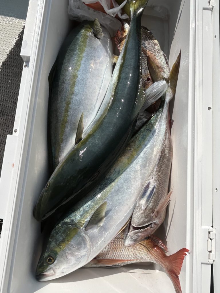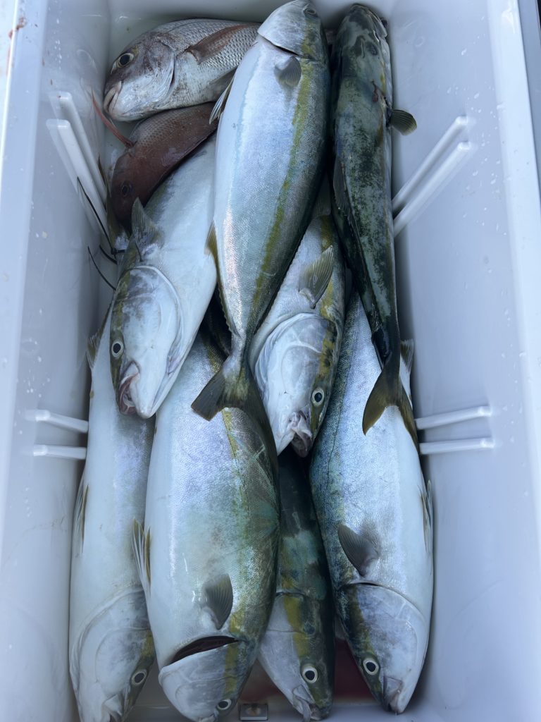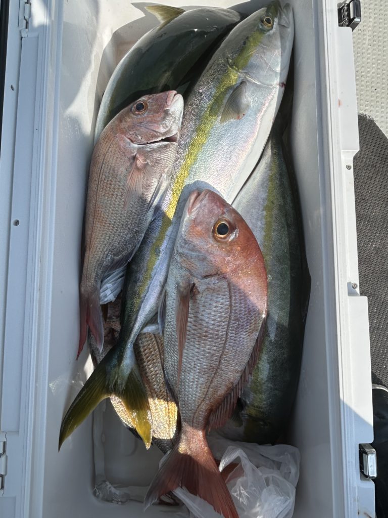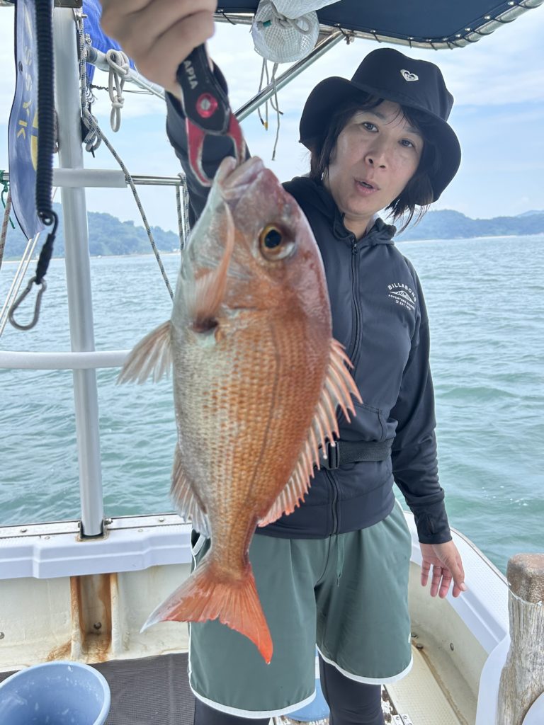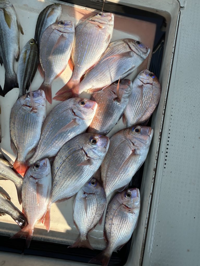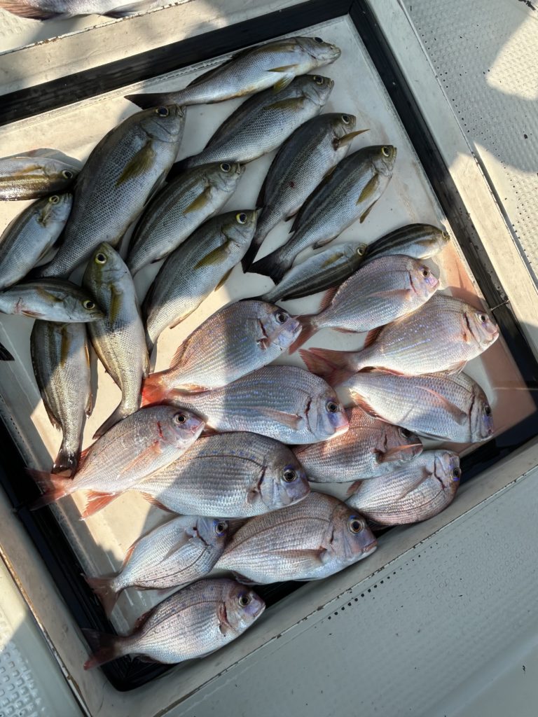 2025年08月14日今日はマキエサを使っての五目釣り、小学生、中学生のお子さんと、お母さん、おじいさんとの4名様.レンタルされたタックルでほぼ船釣り初心者様でしたが、仕掛け投入するとイサキが釣れ、チダイ、小ダイ、ベラ、おまけに良型のマダイをゲット、まずまずの釣果でした。