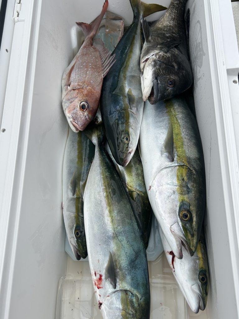 2025年10月18日 今日はハマチ、マダイ狙いで3名様での出船、お昼から悪天候になる為ハマチ狙いは短い時間でしたがハマチ、ヤズはゲット出来ました。
