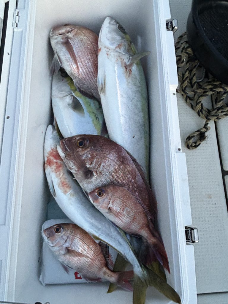 2026年02月15日本日はハマチ、マダイ狙いでお客様の都合で午前9時出船、今日は青物の食いが悪い様で他船も苦戦している中何とかハマチの顔が見れました。またマダイも残り少ない時間の中何とか釣れました