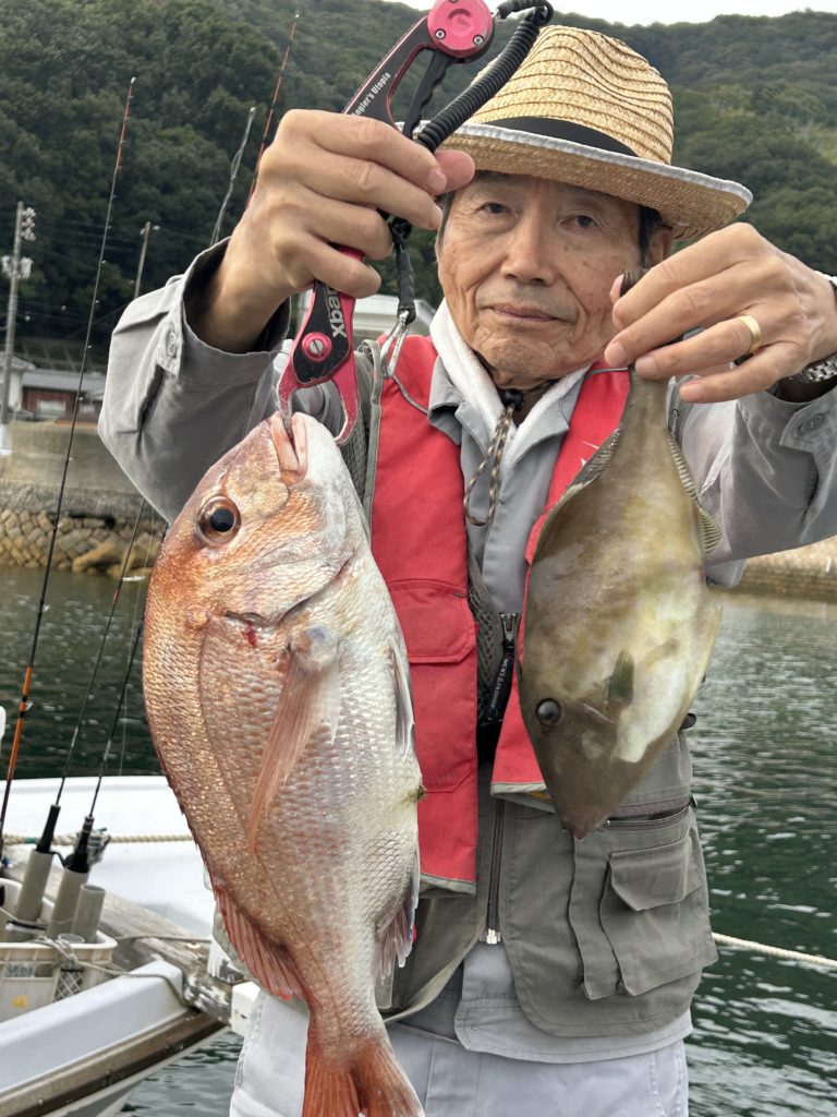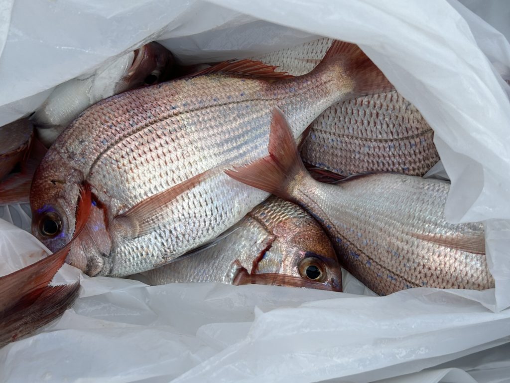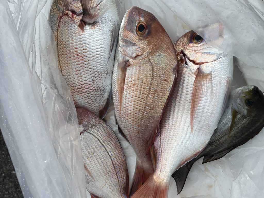 今日は午前11時頃まで波風あるのでまず近場でタイラバやりマダイ3匹ゲット、その後メバル竿で小アジゲットして波が少しおさまったところで、沖に行きマダイ、ハゲ、イサキ、チダイ、ヤズなど少し釣り納竿としました
